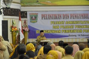 Padang, 14 Februari 2023 – Sekretaris Daerah Provinsi Sumatera Barat (Sekda Prov. Sumbar), Hansastri melantik 79 orang pejabat dilingkungan Pemprov. Sumbar untuk penyegaran dan peningkatan kinerja Organisasi Perangkat Daerah (OPD), di Aula Kantor Gubernur.