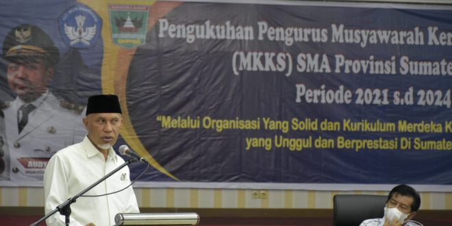 Padang – Gubernur Sumatera Barat (Sumbar), Buya Mahyeldi, resmi mengukuhkan Pengurus Musyawarah Kerja Kepala Sekolah (MKKS) Provinsi Sekolah Menengah Atas (SMA) periode 2021 – 2024, yang diketuai oleh Syafruddin. Pelantikan berlangsung di Aula Kantor Gubernur, Jalan Sudirman Padanf Rabu, (25/5/2022).
