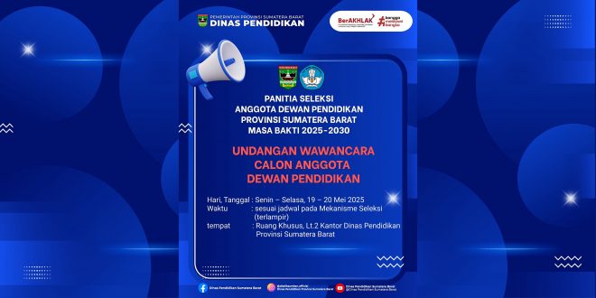 Yth. Bapak Ibu Peserta Calon Anggota Dewan Pendidikan Sesuai jadwal proses Seleksi Tahap II Calon Anggota Dewan Pendidikan Provinsi Sumatera Barat Periode 2025 – 2030, wawancara kandidat akan dilaksanakan pada: Hari, tanggal : Senin – Selasa, 19 – 20 Mei 2025 Waktu : sesuai jadwal pada Mekanisme Seleksi (terlampir) Tempat …