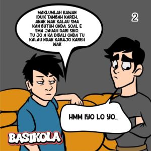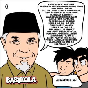 Hai gen Z Sumbar, pasti banyak nan batanyo-tanyo ndak, manga ado komik kini di akun resmi dinas pendidikan Sumbar? Nah, intinyo adola hsupayo kito tahu perkembangan pembangunan Sumbar khususnyo nan dikerjakan oleh Dinas Pendidikan Provinsi Sumatera Barat. Dengan tampilan komik, kito ndak akan bosan lain mancaliak data jo angko nan biasonyo disampaikan sebagai laporan kinerja pemerintah. Sebagai anak mudo nan ka manaruihkan estafet dari nan tuo, sepatutnyo kito tahu baa pemerintah alah berusaha membenahi pendidikan di Sumatera Barat ko, tarutamo untuak pendidikan menengah atas.