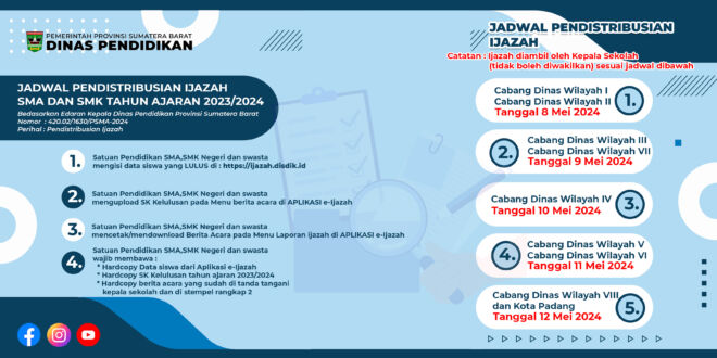 JADWAL PENDISTRIBUSIAN IJAZAH SMA dan SMK Tahun ajaran 2023/2024 Senin, 6 Mei 2024 Halaman Utama Tinggalkan komentar 8,894 Kunjungan Bagikan Facebook Twitter LinkedIn Pinterest Unduh Surat Edaran : Download jadwal pendistribusian ijazah