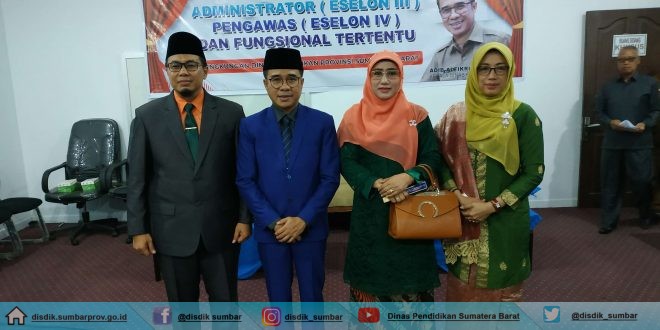 Kepala Dinas Pendidikan Provinsi Sumatera Barat (Kadisdikprov Sumbar) Adib Alfikri melantik 1 pejabat Eselon III dan 1 pejabat Eselon IV lingkungan Disdikprov Sumbar bertempat di Ruang Khusus Disdik Sumbar, Selasa (7/1).