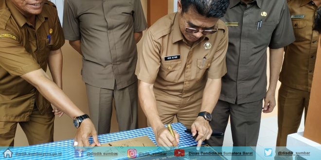 Kepala Dinas Pendidikan Provinsi Sumatera Barat (Kadisdikprov Sumbar) Adib Alfikri didampingi Kabid Pembinaan SMK Joko Purnomo meresmikan dan menandatangani Bangunan Bantuan DAK untuk 19 SMK di Sumbar di SMKN 1 Guguak 50 Kota, Selasa (14/1).
