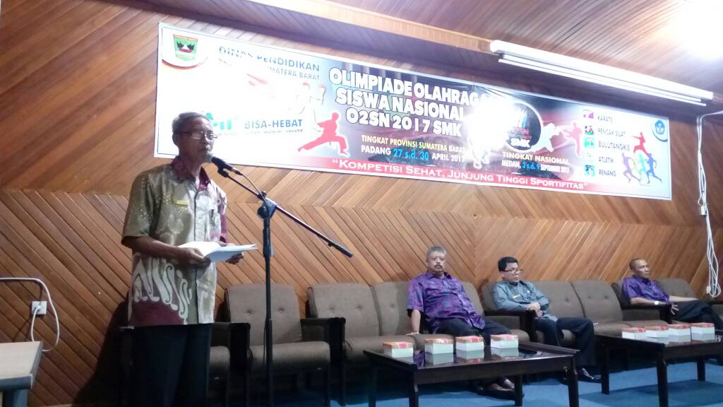 tahun ini peserta O2SN diikuti sebanyak 130 Atlit siswa SMK Se-Sumbar, dalam pembukaan kegiatan ini dibuka oleh Kepala Dinas Pendidikan Provinsi Sumbar, Drs. Burhasman, MM bertempat di Aula Lantai III Baltekkomdik Disdik Sumbar pada kamis malam (27 April 2017). Dalam pembukaan tersebut, Kadis memberi pengarahan kepada para atlit, dalam kesempatannya mengatakan ” olahraga siswa saat ini sudah mengarah pada prestasi, dengan prestasi tersebut nantinya akan menjadi Profesi. Untuk meraih prestasi tentu tergantung kepada kesungguhan dan kegigihan untuk memanfaatkan kesempatan tersebut, terlebih saat ini perlombaan tingkat Provinsi yang cukup bergengsi”.