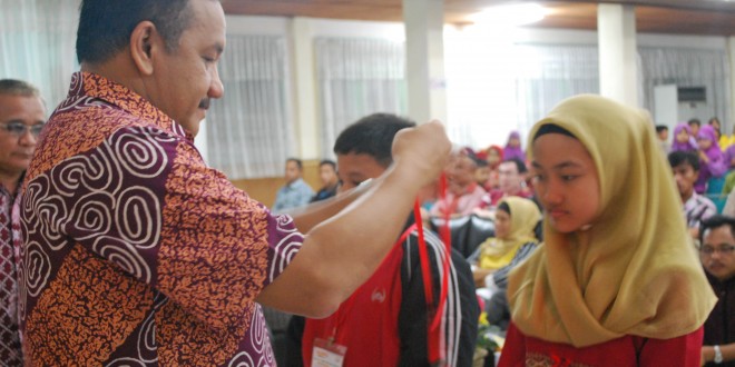 Pemasangan tanda peserta oleh Bapak Drs. Bustavidia kepada peserta yang bernama M. Lutvi Asydqy dari kota Pariaman dan Aristamayu dari kota Padang sekaligus peresmian pembukaan kegiatan festival dan lomba seni siswa Nasional tingkat Sekolah Dasar Provinsi Sumatera Barat.