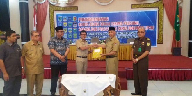 Penandatanganan Berita Acara Serah Terima Personil, Sarana dan Prasarana Serta Dokumen (P2D), Antara Pemerintah Pusat, Pemerintah Provinsi Sumatera Barat dan Pemerintah Kab/Kota se Sumatera Barat, di Auditorium Gubernuran.