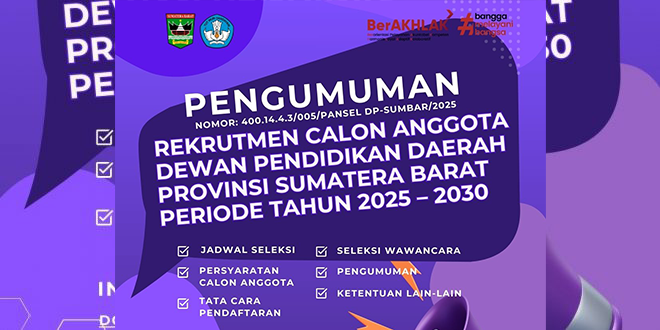 Bersama ini diumumkan bahwa Pemerintah Daerah Provinsi Sumatera Barat melakukan Rekrutmen Calon Anggota Dewan Pendidikan Daerah Provinsi Sumatera Barat Periode 2025-2030 dengan ketentuan sebagai berikut :