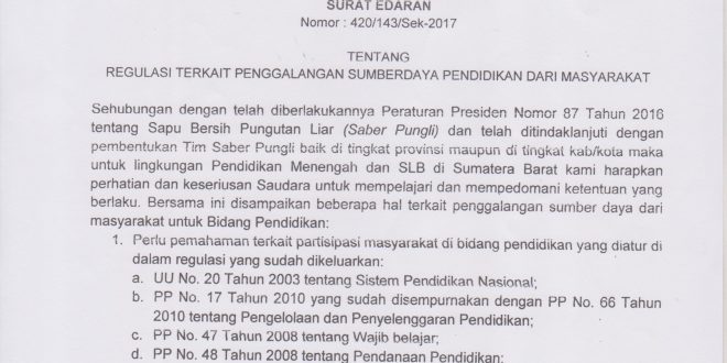 Kepala Dinas Pendidikan Provinsi Sumatera Barat, Drs, Burhasman. MM memberi isyarat mengenai larangan Pungli di sekolah. Sekolah sebagai sebuah lembaga pendidikan memiliki tugas dan tanggung jawab kepada negara dan masyarakat. Sebagian tugas yang menjadi kewajiban sekolah adalah pengelolaan keuangan dan pendidikan anak-anak bangsa. Kedua hal ini menjadi bagian yang tidak terpisahkan dimana tugas mendidik memerlukan dukungan keuangan dan pengelolaan keuangan semaksimal mungkin untuk mendidik, melatih, dan membimbing anak didik.