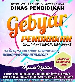 Gebyar pendidikan yang merupakan agenda kegiatan tahunan yang dilaksakan oleh Dinas Pendidikan dan Kebudayaan Provinsi Sumatera Barat (Disdik Sumbar) untuk tahun ini melalui Bidang Pendidikan Sekolah Menengah Kejuruan (PSMK) dan tahun ini sudah memasuki Gebyar Pendidikan ke-7 yang akan diselenggarakan pada 26 s/d 28 September 2018 mendatang.