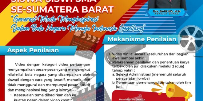 Dalam Rangka memperingati Hari Bela Negara ke 75 Tahun yang jatuh pada tanggal 19 Desember 2023 nanti, dan merupakan salah satu momen untuk penanaman serta penumbuhan sikap Nasionalisme dan Patriotisme generasi muda secara umum dan Peserta Didik secara khusus terhadap bangsa dan Negara, Dinas Pendidikan Provinsi Sumatera Barat melalui Balai TIK Pendidikan dengan Bidang Pembinaan SMA akan mengadakan Lomba Video Kreatif Siswa-siswi SMA se Sumatera Barat Tahun 2023, dengan tema “Dengan Semangat Bela Negara Menginspirasi Generasi Muda Menuju Indonesia Gemilang. Kegiatan tersebut diharapkan nantinya akan dapat menumbuhkan wawasan, nilai Bela Negara, dan Cinta Tanah air bagi generasi muda dari sejak dini di lingkungan sekolah.